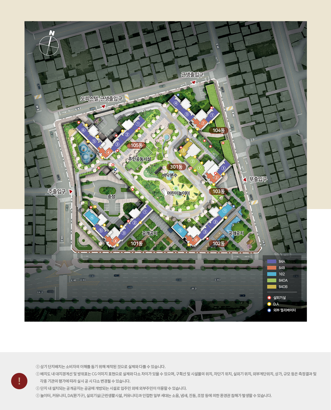 대지면적 약 2만7천㎡, 연면적 약 14만9천㎡ 규모로 설계되었고, 주차는 세대당 여유를 고려해 지하에 집중 배치했습니다. 공급형태는 실수요 선호가 높은 전용 84㎡, 102㎡의 투 트랙. 오피스텔도 84㎡ 단일성격으로 구성해 투자와 실거주 수요를 동시에 겨냥했습니다. 힐스테이트 서대구역 센트럴이라는 이름값에 걸맞게 외관은 수직 라인과 투명 난간을 조합해 도시 스카이라인에 조형감을 더합니다.