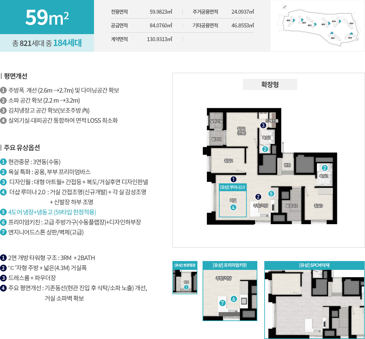 선호도 높은 중소형 라인업이 중심입니다. 전용 59㎡는 2면 개방형 구조로 거실과 주방의 거리감을 줄여 실사용 면적 체감을 키웠고, ㄷ자형 주방과 넓은 거실 폭이 핵심 포인트입니다. 전용 73㎡는 정석 4Bay 판상형으로 맞통풍과 채광이 탁월하며 현관 창고와 팬트리, ㄱ자형 드레스룸을 더해 수납 동선을 깔끔히 정리했습니다. 전용 84㎡는 3룸에 알파룸을 더해 서재나 취미실, 키즈룸까지 다양한 변주가 가능하고, 보조주방과 케어룸 특화로 생활 디테일까지 챙겼습니다. 일부 84㎡C는 사선형 거실 동선으로 공간 확장감과 프라이버시를 동시에 확보했습니다. 더샵 당리 센트리체가 중소형 중심임에도 확장성과 수납을 촘촘히 설계한 이유가 분명해집니다.