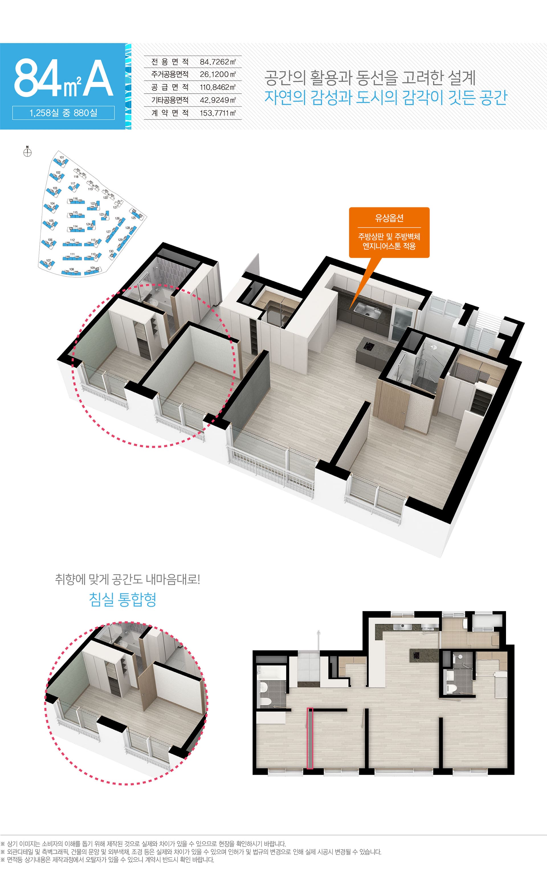 84A: 4Bay 판상·전면 채광·맞통풍·팬트리·드레스룸·알파룸. 가족 성장에 따라 방/수납 가변이 쉬움.