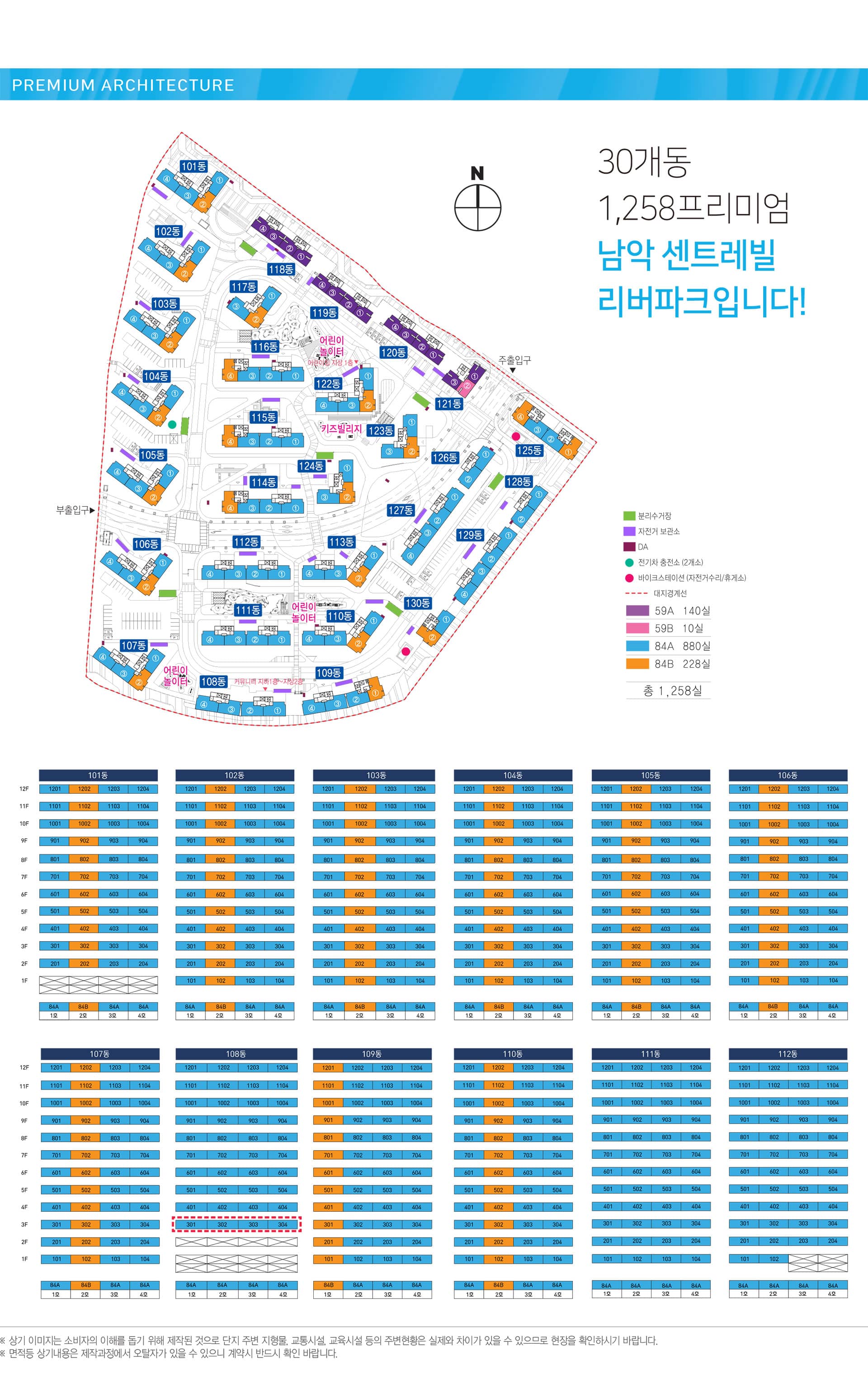 남악 동부 센트레빌 리버파크는 지하 1층~지상 12층, 30개 동, 1,258실의 공원형 수변 대단지로, 59·84㎡ 실수요 평형 중심, 여유 주차·남향 위주·넓은 동간거리 설계를 갖춘 것이 특징입니다.