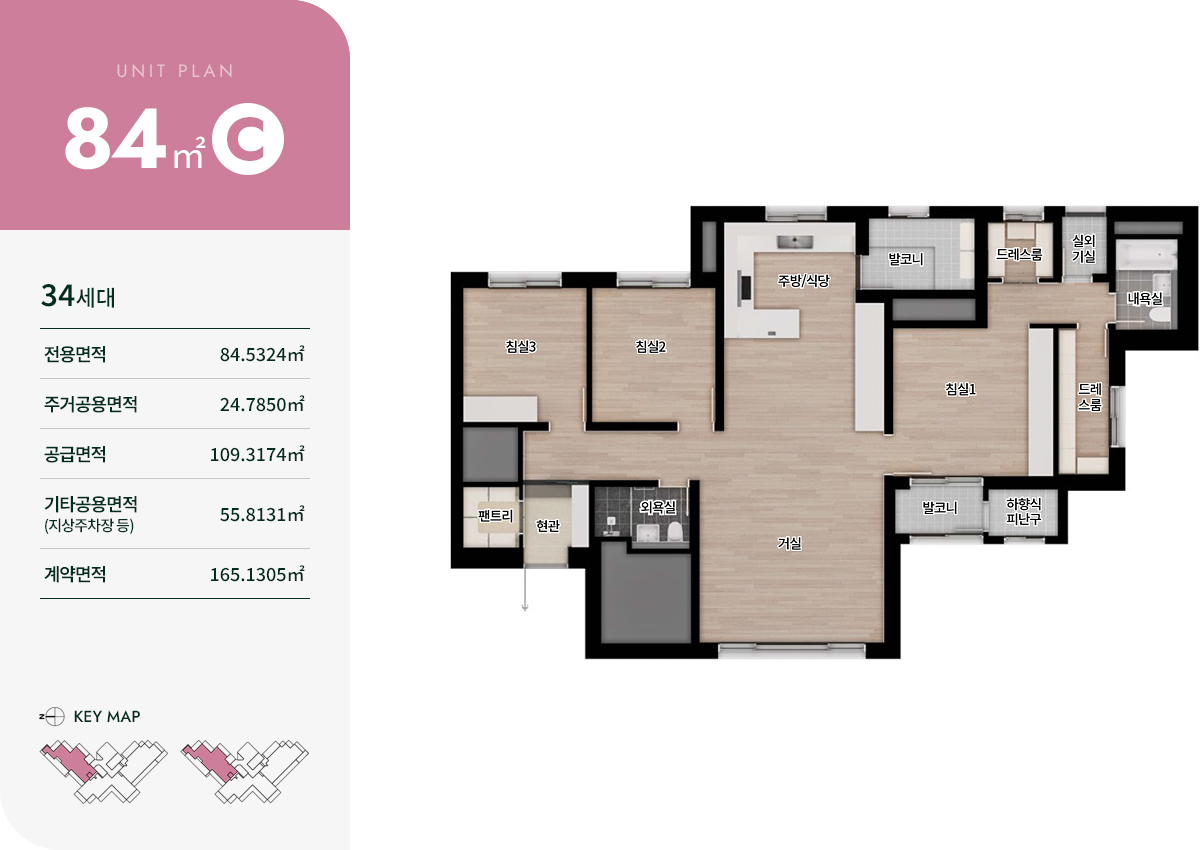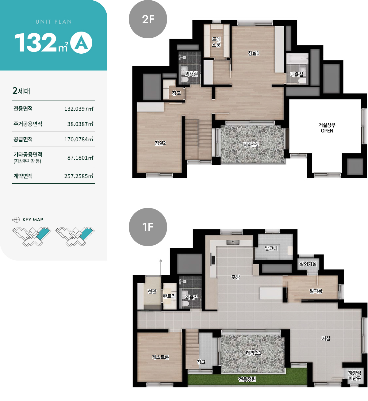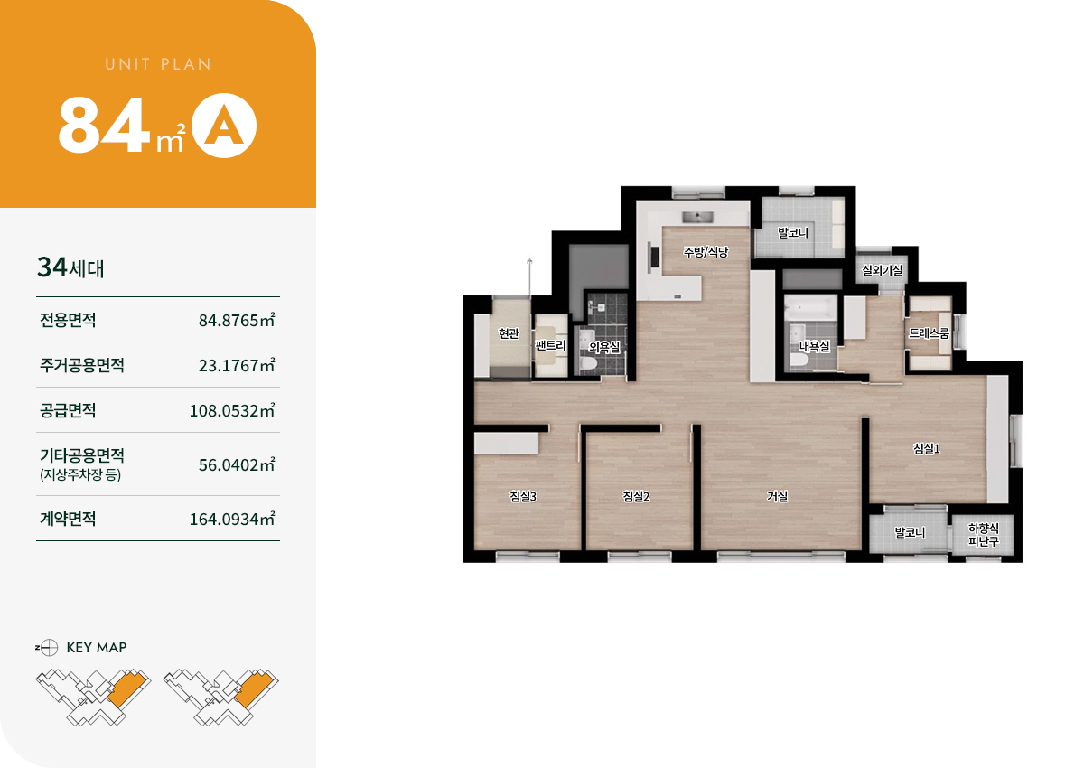 아파트는 전용 84㎡와 132㎡, 여섯 가지 혁신 평면으로 제공합니다. 84㎡는 4Bay와 알파공간을 통해 거실과 주방의 개방감을 키웠고, 복도 팬트리와 현관 수납, 마스터 드레스룸으로 수납 효율을 극대화했습니다. 최상층에는 복층 펜트하우스가 배치되어 희소가치를 높였습니다. 오피스텔은 전용 84㎡ 단일 면적이지만 세 가지 평면으로 차별화해 1~3인 가구부터 신혼, 세컨드 하우스 수요까지 폭넓게 포용합니다. 더파크 수성못은 서비스 면적을 넉넉히 두어 체감 면적이 넓습니다.