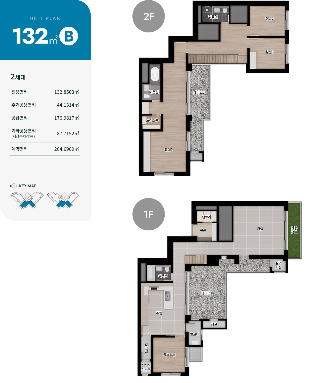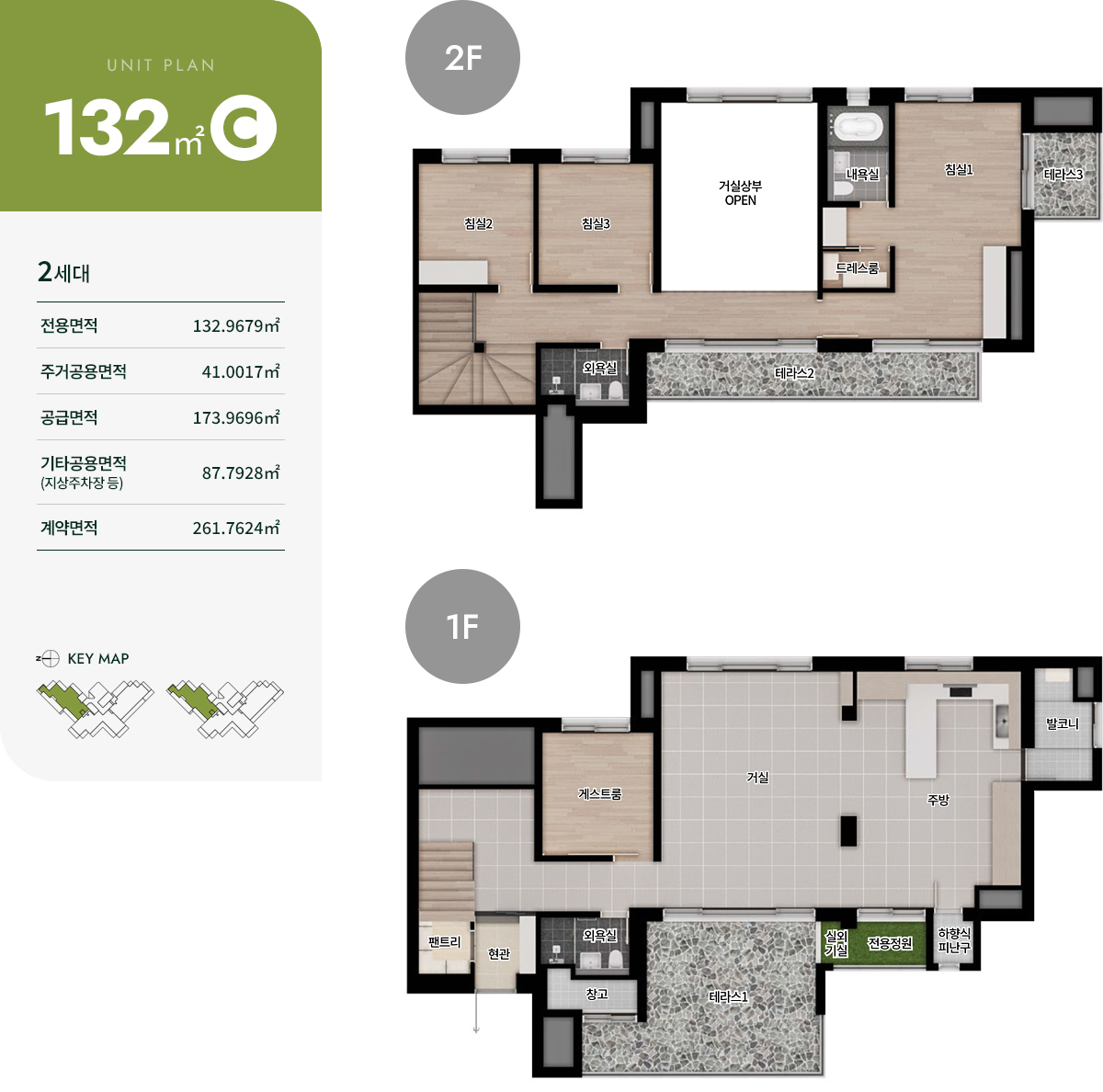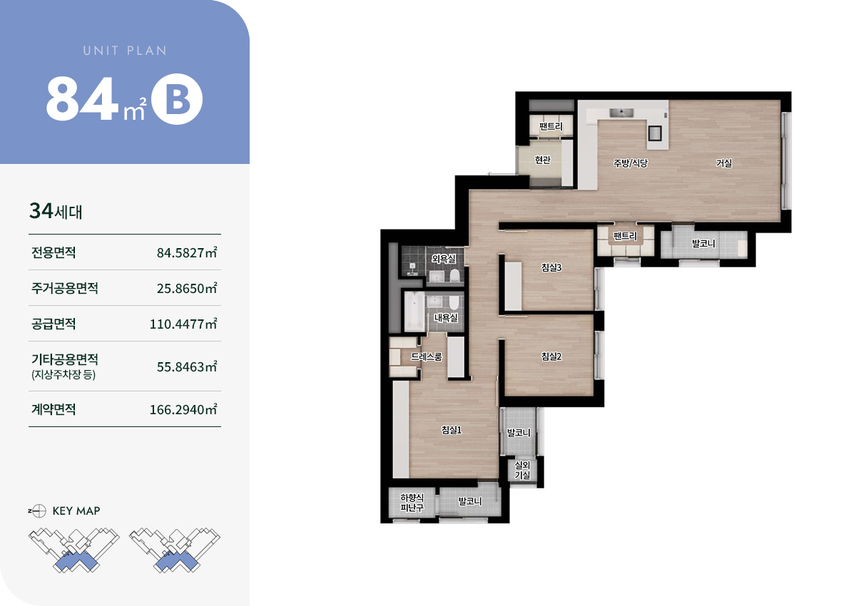 아파트는 전용 84㎡와 132㎡, 여섯 가지 혁신 평면으로 제공합니다. 84㎡는 4Bay와 알파공간을 통해 거실과 주방의 개방감을 키웠고, 복도 팬트리와 현관 수납, 마스터 드레스룸으로 수납 효율을 극대화했습니다. 최상층에는 복층 펜트하우스가 배치되어 희소가치를 높였습니다. 오피스텔은 전용 84㎡ 단일 면적이지만 세 가지 평면으로 차별화해 1~3인 가구부터 신혼, 세컨드 하우스 수요까지 폭넓게 포용합니다. 더파크 수성못은 서비스 면적을 넉넉히 두어 체감 면적이 넓습니다.