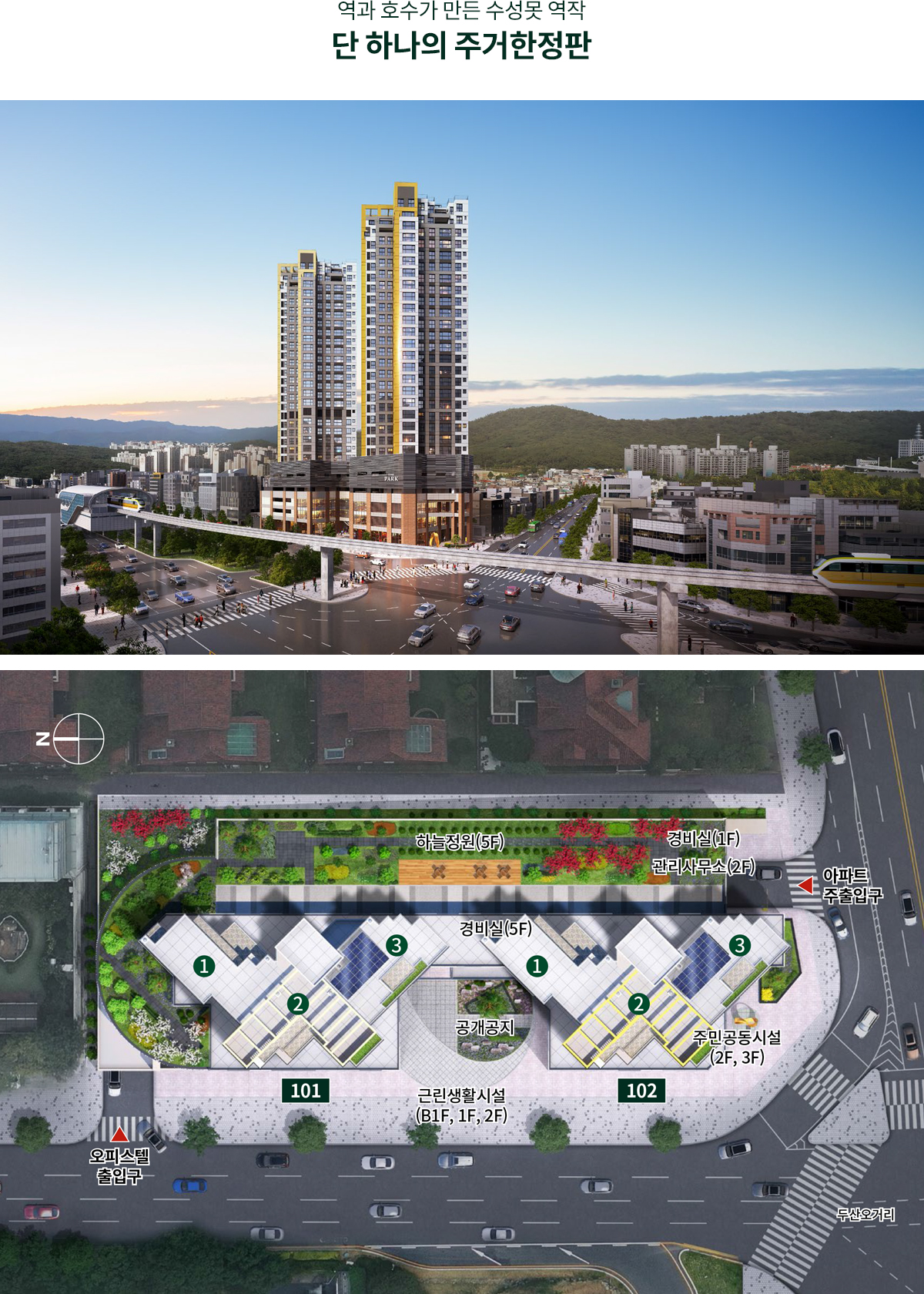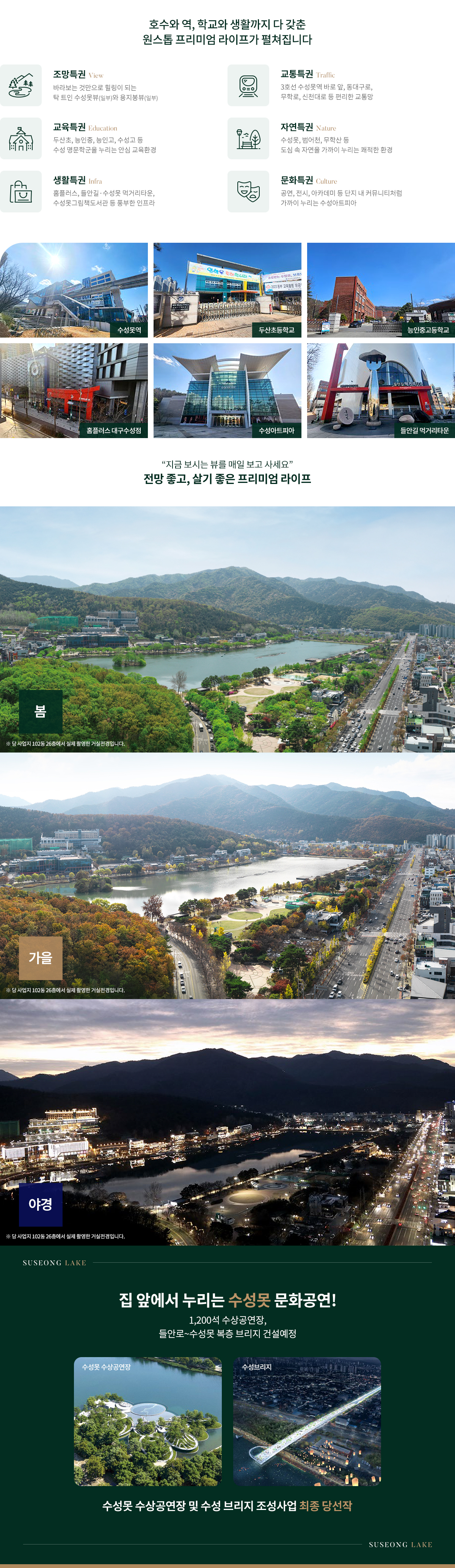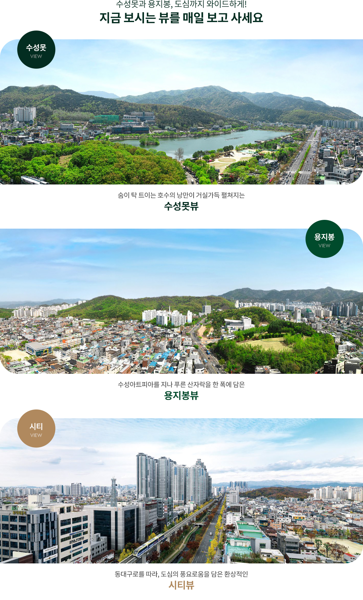 수성못 호수공원, 용지봉 숲, 범어천이 그리는 그린 스캐프가 단지의 고정 조망 자원입니다. 전면 레이크뷰와 측면 마운틴뷰가 상황에 따라 펼쳐져 사계절의 색이 집 안으로 들어옵니다. 더파크 수성못은 수성못역에서 도보 약 50m, 초역세권 입지로 도심 접근성이 뛰어나면서도 호수의 여유를 함께 누립니다.