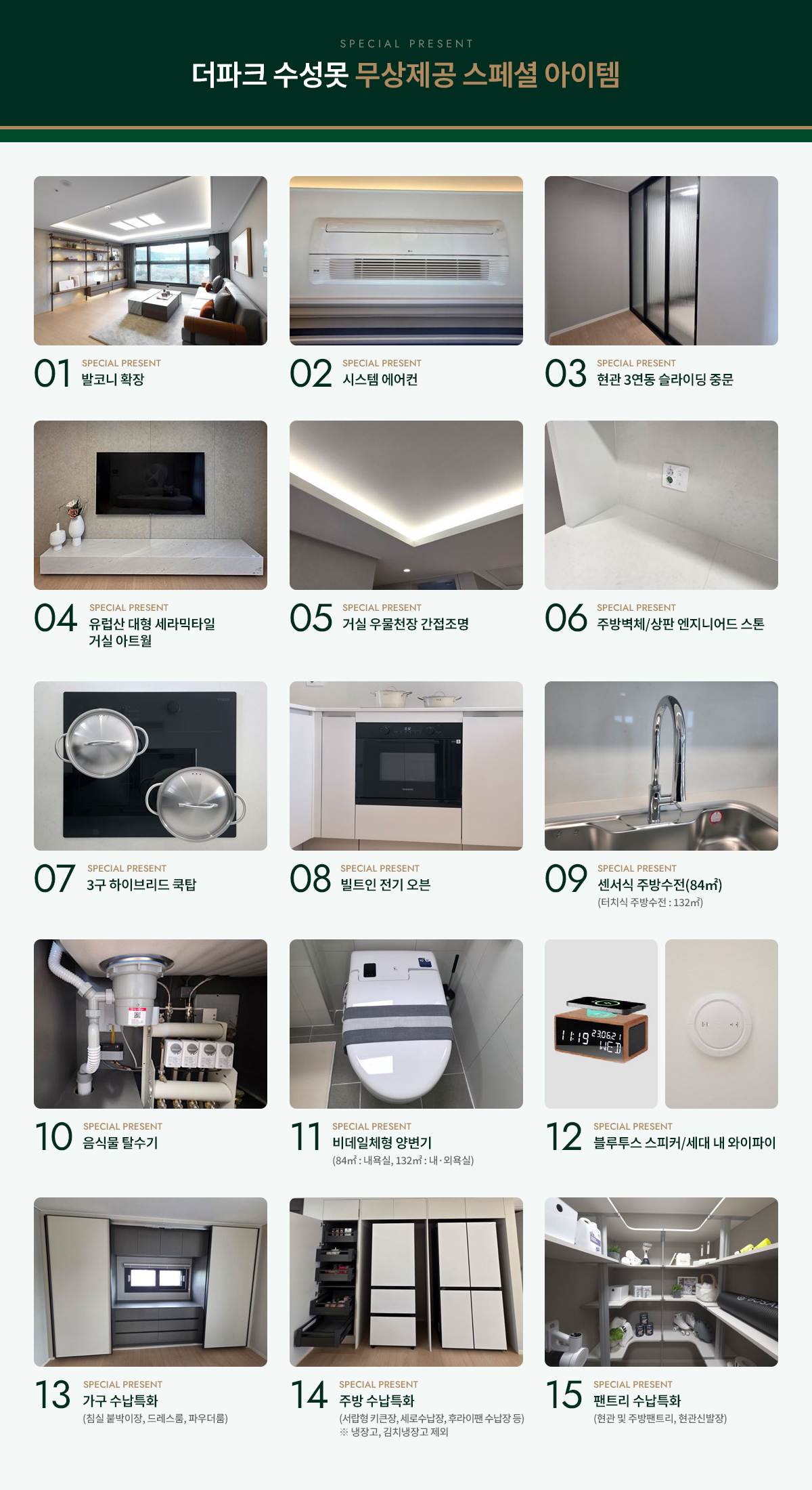 후분양 상품인 만큼 잔금 타이밍이 명확합니다. 주택담보대출 한도·금리, 확장 및 가전 패키지 선택, 취득세·등기비용까지 한 번에 반영한 ‘입주 D데이 자금표’를 미리 그려보시길 권합니다. 분양가 테이블과 무상 제공 품목(발코니 확장, 시스템 에어컨, 현관 슬라이딩 중문 등 프로모션 항목)은 동·호수별로 상이할 수 있어 현장 확인이 필수입니다. 더파크 수성못은 즉시 입주 가능성이 자금 계획의 예측 가능성을 높여 줍니다.