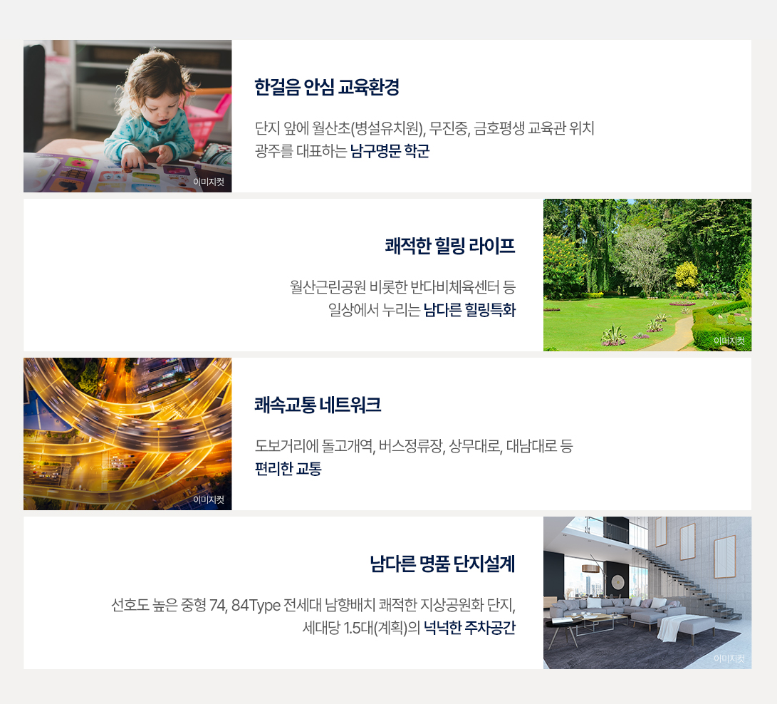 월산로를 따라 근린상권이 촘촘하고, 차량 10분 권역에 신세계·롯데백화점 등 광역 쇼핑·문화 인프라가 포진합니다. 도보권 월산근린공원, 인근 의료시설(동신대 한방병원 등) 접근성도 우수해 건강·여가 동선이 짧습니다. 도심형 라이프와 힐링 요소를 동시에 챙긴 구성이 두산위브 트레지움 월산의 생활 경쟁력입니다.