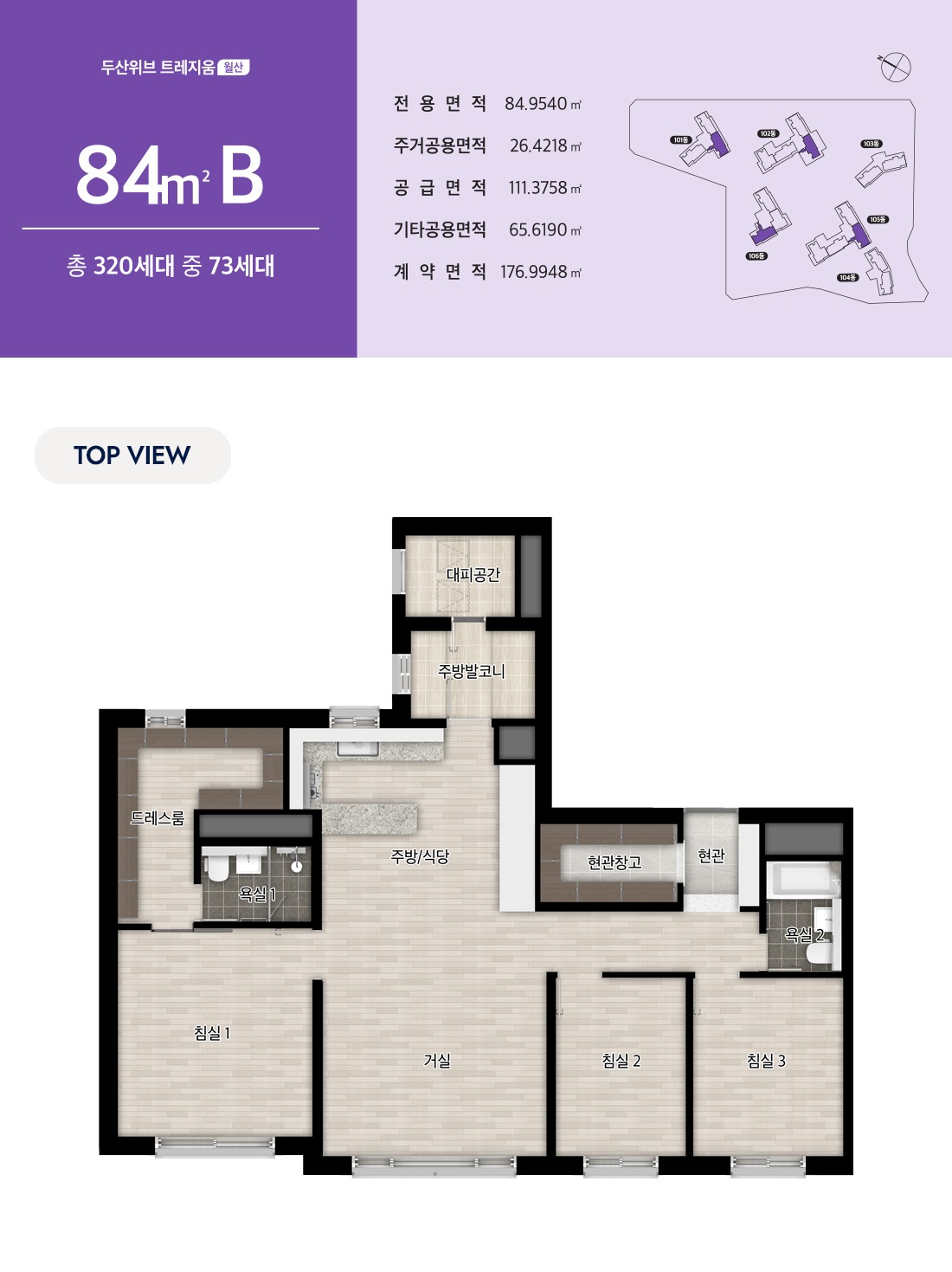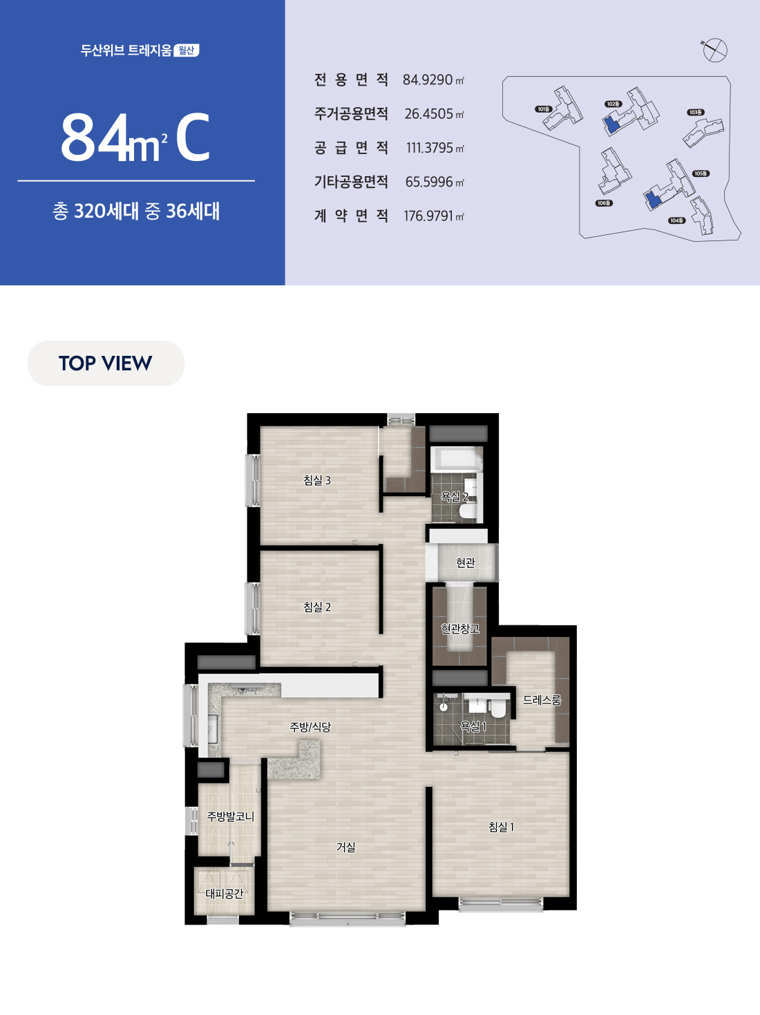 실수요 선호가 높은 74·84㎡ 중소형으로 구성됐고, 특히 84㎡는 A~D 네 가지 타입으로 세분화했습니다. 84A·B는 4베이 판상형으로 거실·주방 맞통풍, 침실 전면 남향 배치가 장점입니다. 84C·D는 타워형 특성을 살려 침실 간 이격을 키워 프라이버시가 좋고, 가족 공용공간은 넓게 연출했습니다. 타입 공통으로 드레스룸·현관창고·다용도실 등 수납 특화를 강화해 체감 면적을 키운 것이 두산위브 트레지움 월산의 강점입니다.