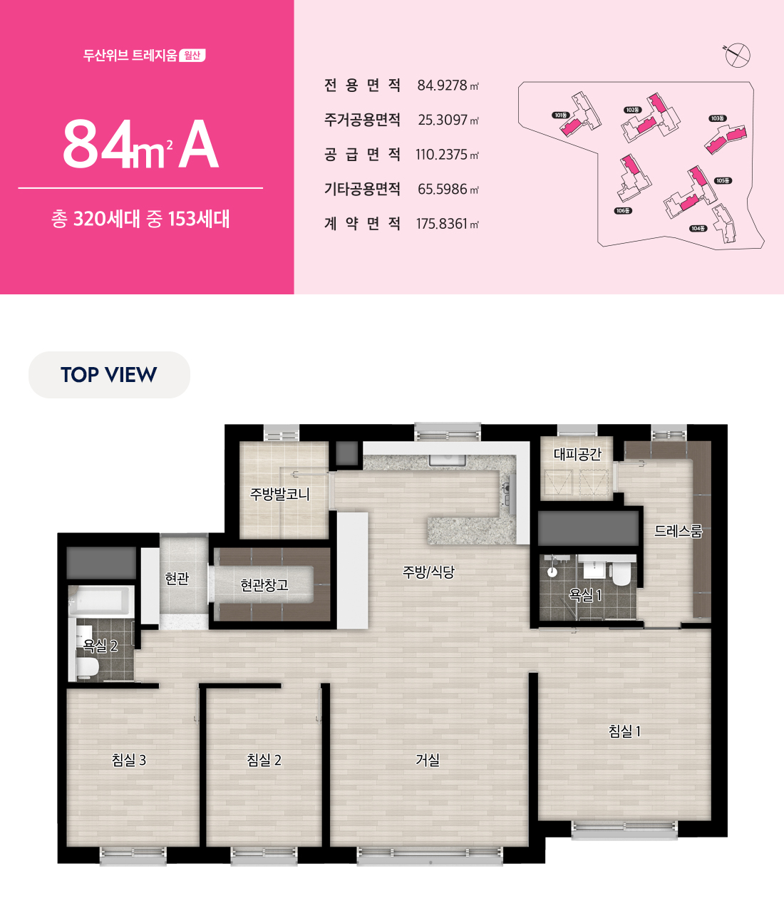 대지는 약 5,086평, 연면적 17,381평 규모로 용적률 212.03%의 여유로운 스펙입니다. 지하 3층~지상 20층, 총 6개 동 320세대이며 이 중 일반분양 71세대가 공급됩니다. 주차는 480대(세대당 약 1.52대)로, 퇴근 시간대 혼잡을 줄일 수 있는 수준입니다. 모든 주동은 남향 위주 배치로 계획돼 일조·채광을 확보했고, 동간 시선이 교차하지 않도록 배려한 점이 두산위브 트레지움 월산의 차별점입니다.