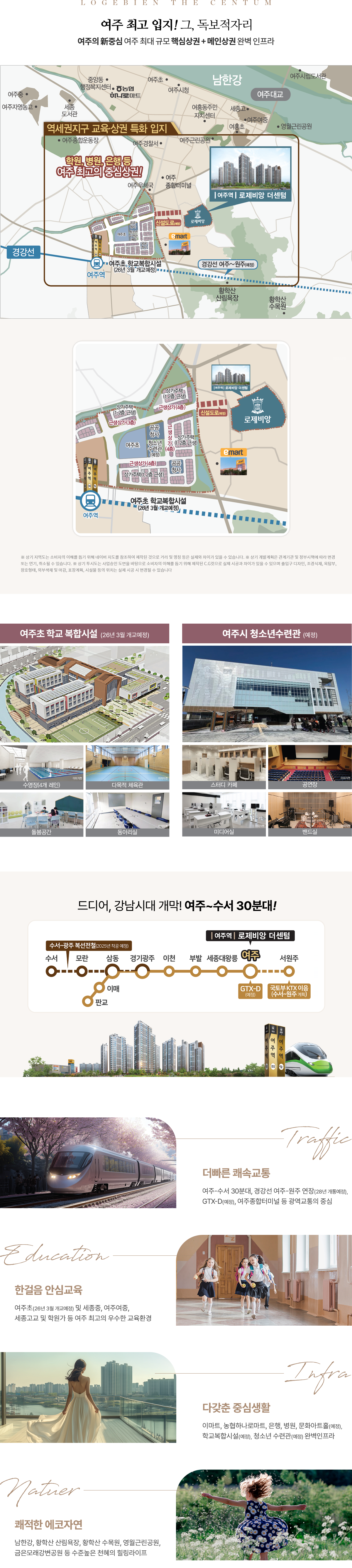 단지 인근으로 식자재마트, 이마트, 하나로마트, 전통시장 등 생활 편의가 촘촘합니다. 행정복지센터·세무서·시청·우체국 등 공공기관 접근성도 좋아 민원·행정 업무가 수월합니다. 병원·약국과 같은 의료 편의 역시 생활권 내에서 해결 가능한 스케일입니다. 이러한 일상 편의는 여주역 로제비앙 더센텀의 ‘생활 완결성’을 높이는 핵심입니다.