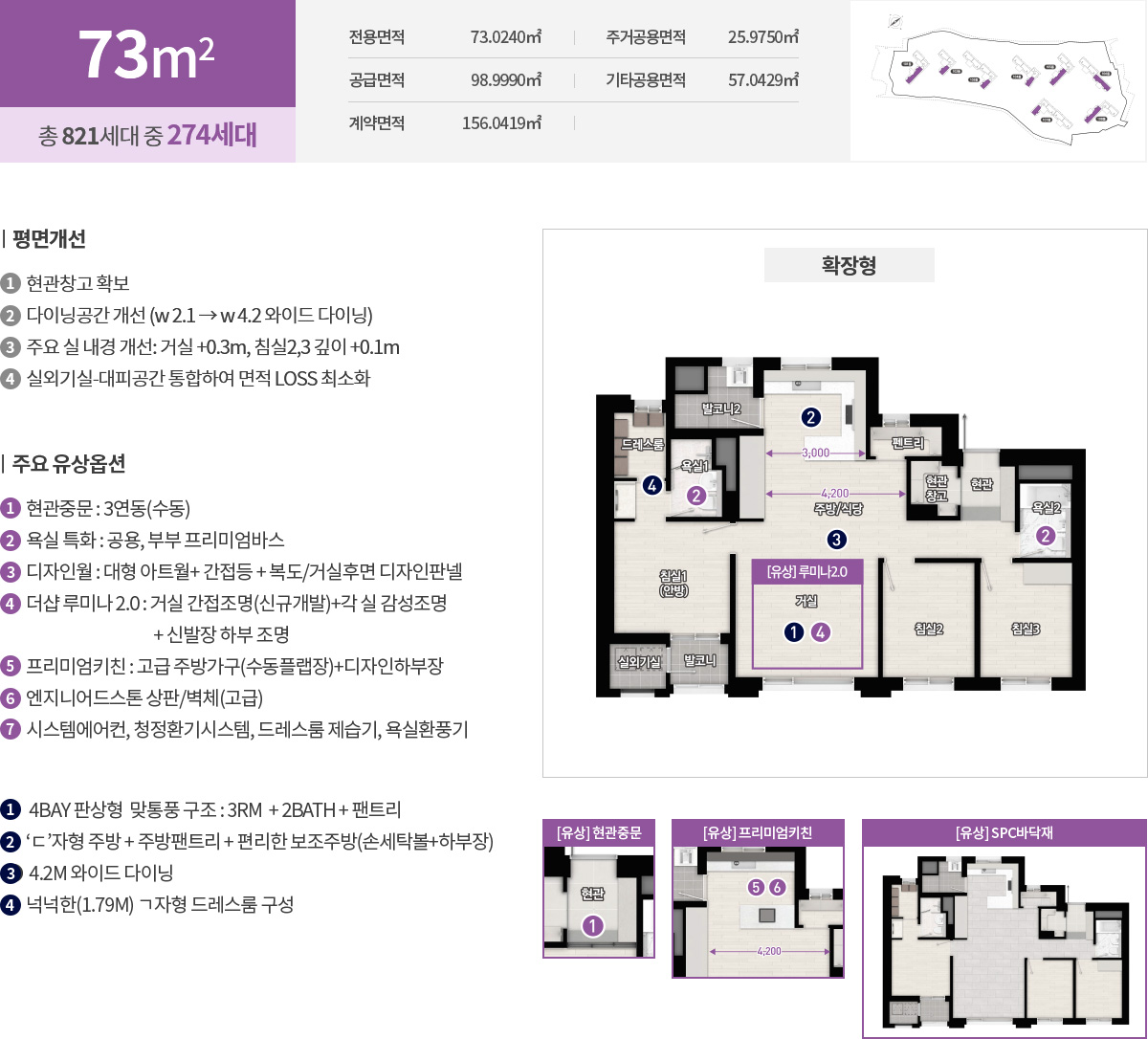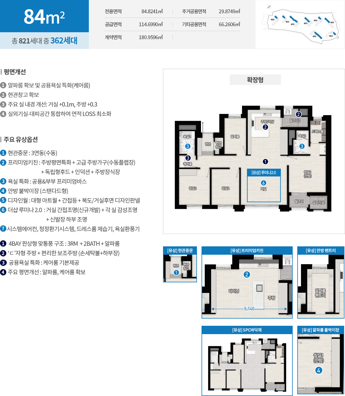 선호도 높은 중소형 라인업이 중심입니다. 전용 59㎡는 2면 개방형 구조로 거실과 주방의 거리감을 줄여 실사용 면적 체감을 키웠고, ㄷ자형 주방과 넓은 거실 폭이 핵심 포인트입니다. 전용 73㎡는 정석 4Bay 판상형으로 맞통풍과 채광이 탁월하며 현관 창고와 팬트리, ㄱ자형 드레스룸을 더해 수납 동선을 깔끔히 정리했습니다. 전용 84㎡는 3룸에 알파룸을 더해 서재나 취미실, 키즈룸까지 다양한 변주가 가능하고, 보조주방과 케어룸 특화로 생활 디테일까지 챙겼습니다. 일부 84㎡C는 사선형 거실 동선으로 공간 확장감과 프라이버시를 동시에 확보했습니다. 더샵 당리 센트리체가 중소형 중심임에도 확장성과 수납을 촘촘히 설계한 이유가 분명해집니다.