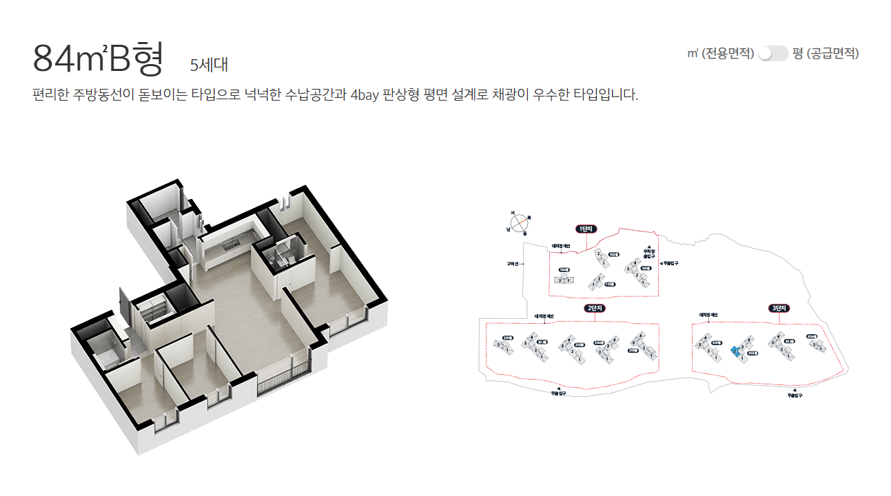 전용 59㎡·84㎡의 중소형으로만 구성했고 두 타입 모두 4베이 판상형입니다. 특히 84A는 맞통풍이 가능한 동선, 드레스룸·현관 팬트리·연결형 다이닝으로 가사 효율이 높습니다. 태양광 발전, 실별 온도 제어, 전열교환 환기, 홈 IoT로 마감한 스마트 설계는 실거주 만족도를 끌어올립니다. 소형이라도 수납과 환기, 동선에서 불편을 줄이는 설계가 일산 이편한세상 메이포레 의 경쟁력입니다.