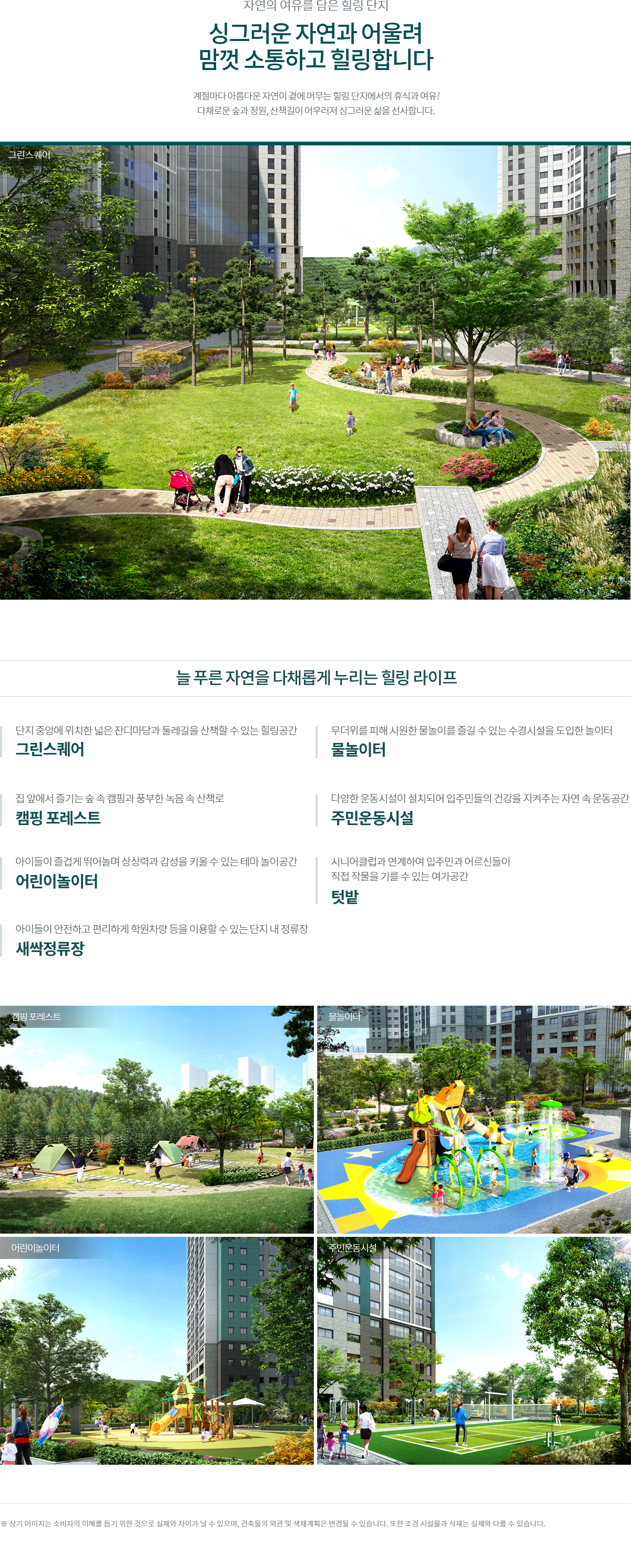 지상은 최소한의 차량 동선만 남기고 보행 중심으로 설계했습니다. 물놀이터와 그린스퀘어, 캠핑존, 단지 순환 산책로가 유기적으로 이어지며, 곳곳의 휴게 데크와 필로티 하부 커뮤니티가 그늘과 바람을 품습니다. 실내에는 피트니스·실내골프·그리너리 스튜디오, 어린이집·독서실·스터디룸 등 전 세대가 쓰기 좋은 시설을 배치했습니다. 퇴근 후 아이는 스터디룸에서 숙제를 마치고, 부모는 피트니스로 가벼운 운동을, 주말에는 캠핑존에서 간단한 브런치를 즐기는 장면이 자연스레 그려집니다. 이 ‘집 앞 10분 생활권’의 밀도가 광양 푸르지오 센터파크의 차별점입니다.