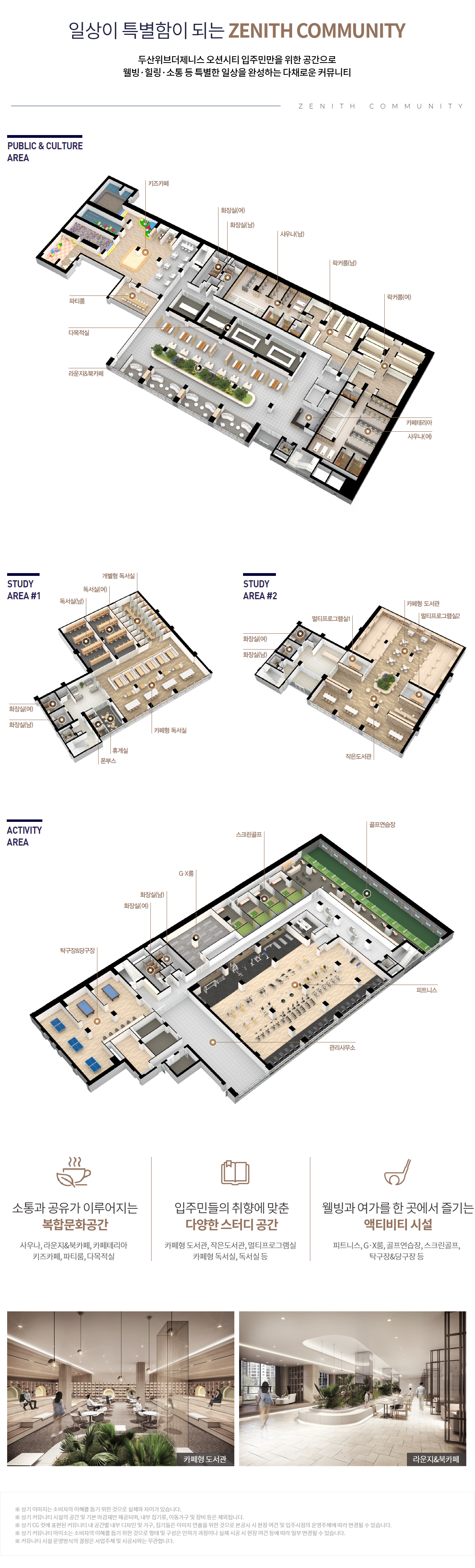라운지, 카페테리아, 작은도서관, 남녀 분리 독서실 등 학습과 휴식의 밀도를 높이는 공간 구성이 돋보입니다. 피트니스, GX룸, 스크린골프장은 일상 운동 루틴을 단지 안에서 완결시켜 주는 장치입니다. 사우나와 키즈 특화 커뮤니티는 세대 구성과 무관하게 체류 시간을 늘리는 요소로, 두산위브더제니스 오션시티에서의 주말은 외출 계획이 없더라도 충분히 풍요로울 수 있습니다.